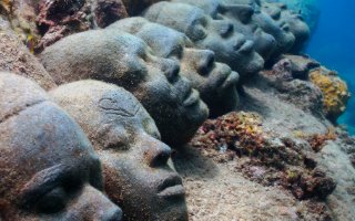 ...d'un parc sous-marin où des statues sont disposées un peu partout. En cercle, assis sur un banc, ou à une table avec un café et un plateau de fruits ou une machine à écrire. Les scènes de vie sont figées sous nos yeux et les seules choses qui trahissent leur inanité sont ces poissons colorés qui leur tournent autour et leur arrachent parfois des bouts de peaux d'algues puis s'en vont les déguster plus loin.
